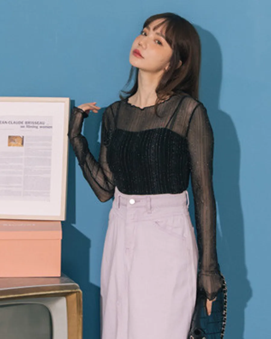 ▲限時搶購380▼透肌感亮絲細條紋網紗打底上衣
