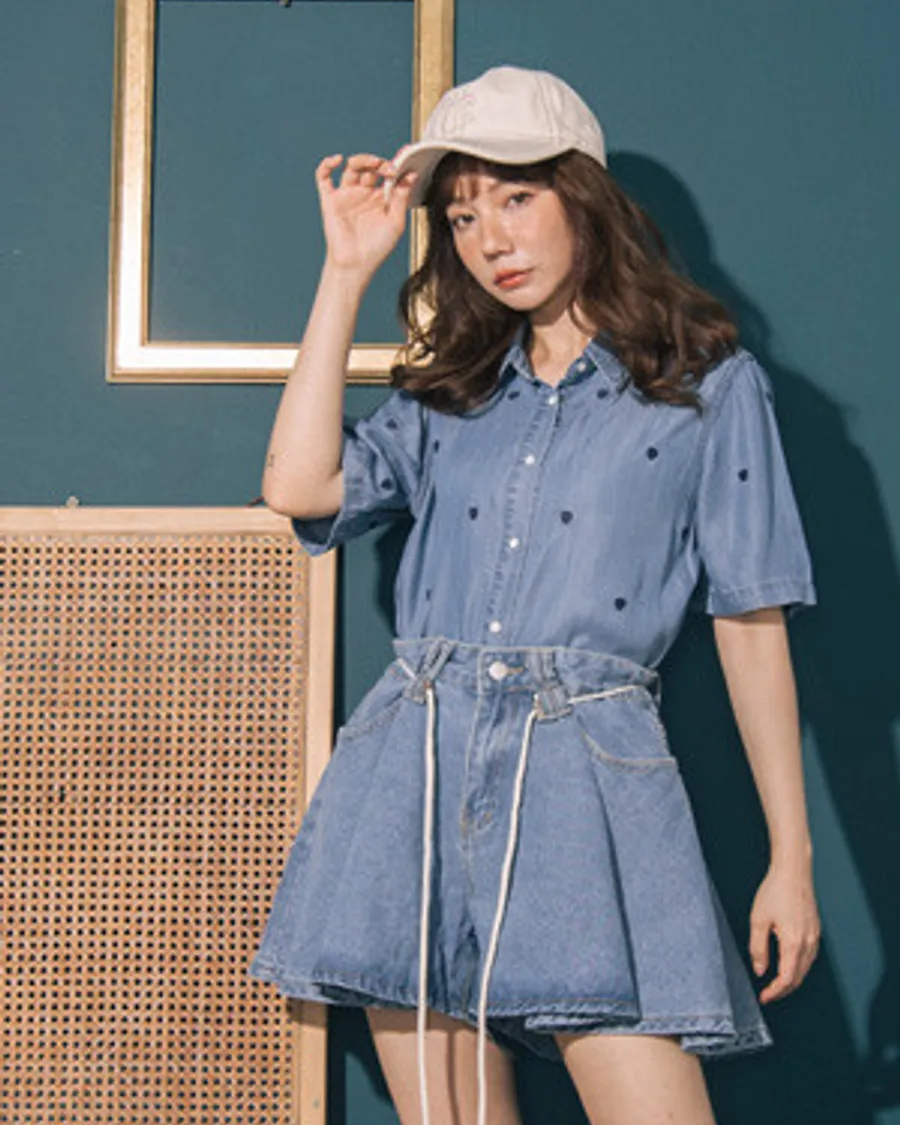 重工刺繡愛心天絲牛仔短襯衫