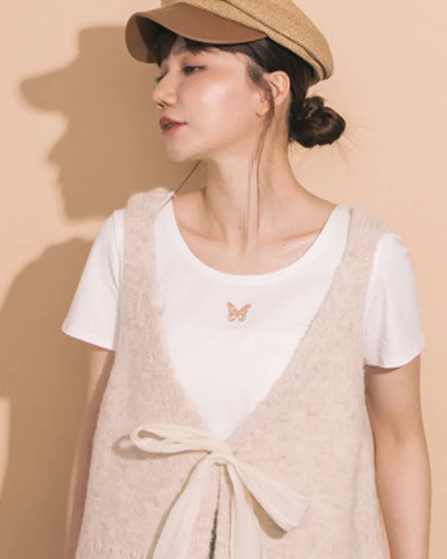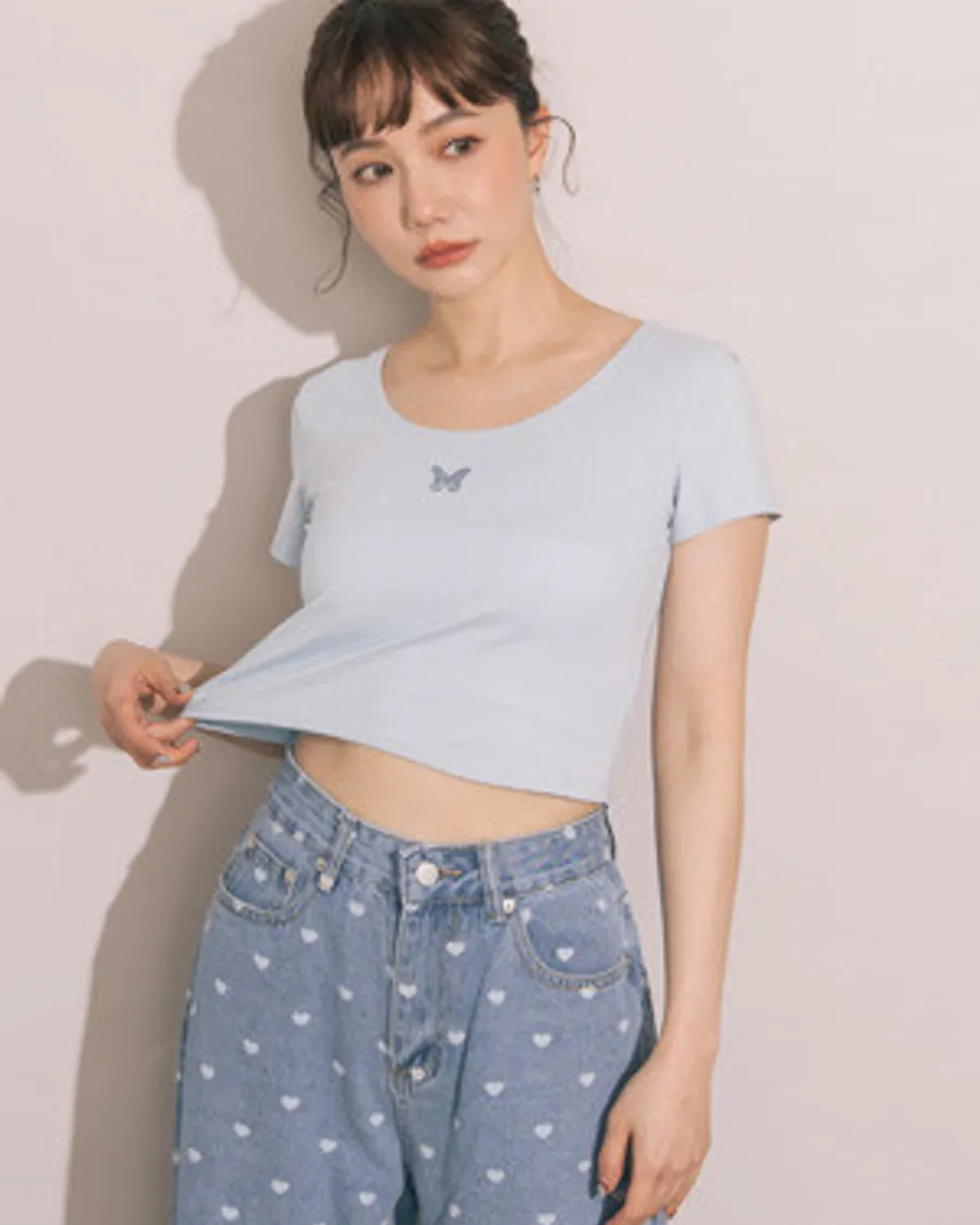 細緻刺繡蝴蝶大U領棉質短T