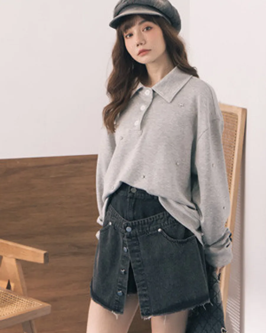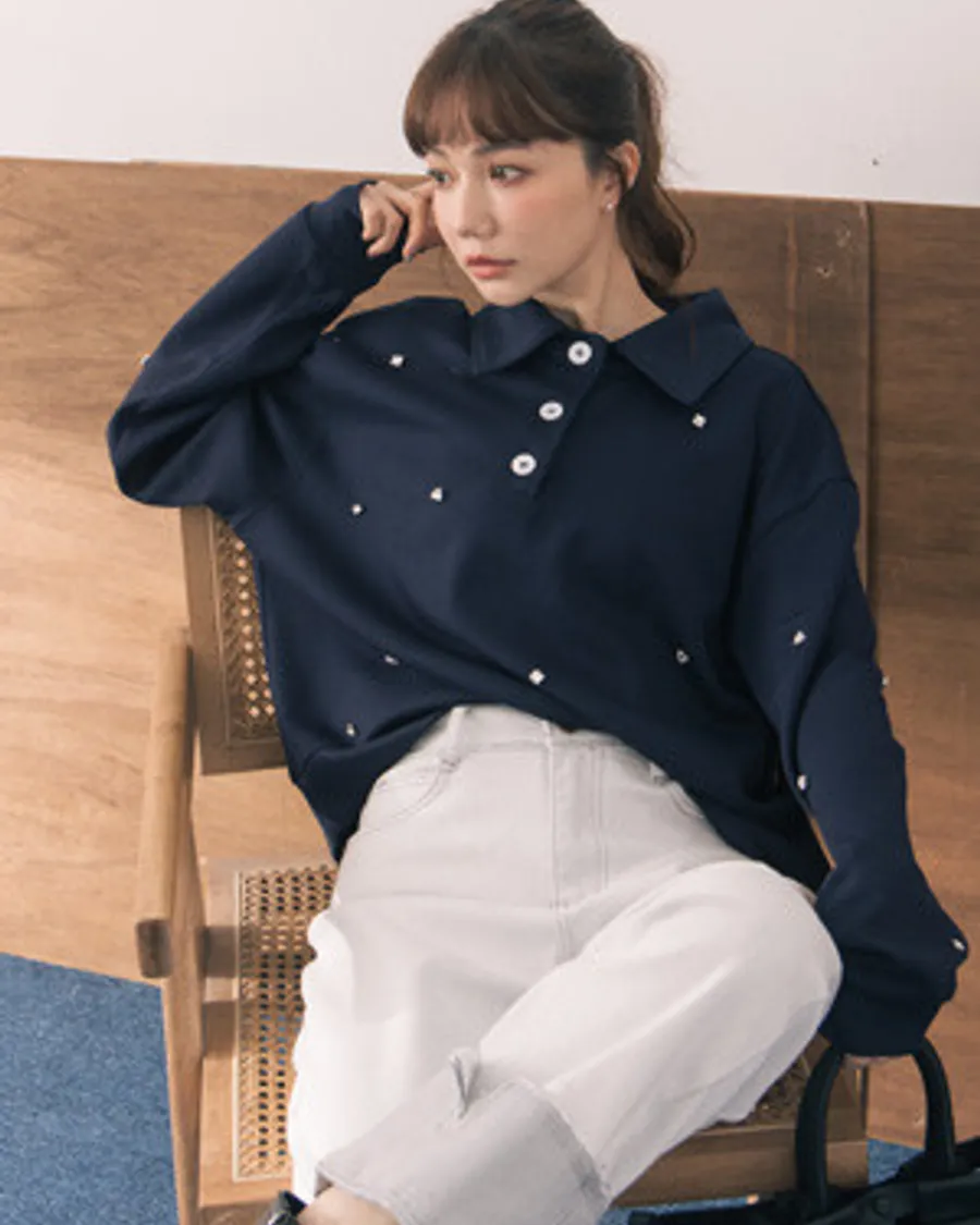 ▲限時搶購780▼慵懶感立體亮鑽翻領天絲太空棉寬T