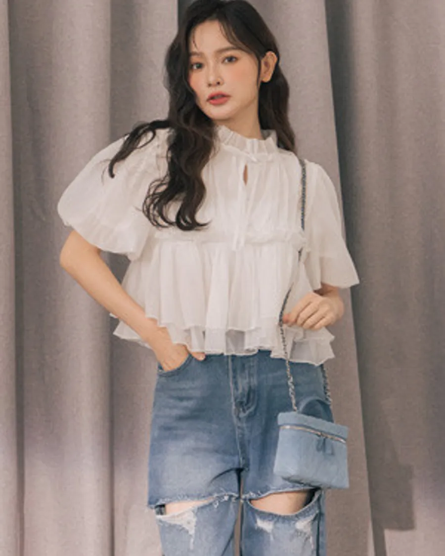 宮廷立領綁帶泡泡袖雙層下擺雪紡上衣