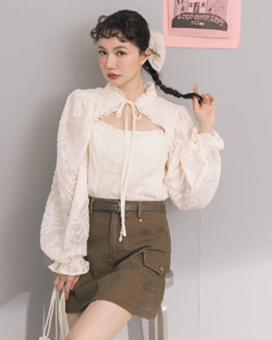 宮廷刺繡紋理綁帶簍空立領珍珠釦襯衫