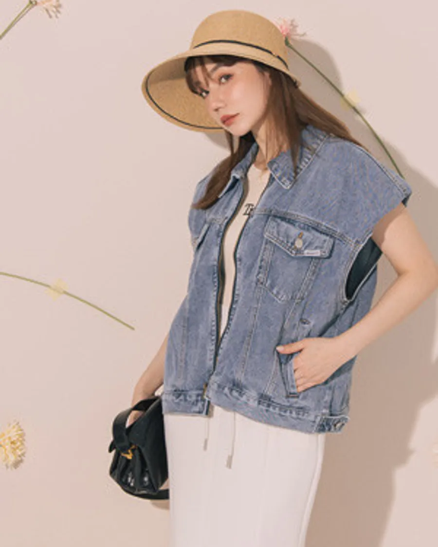 復古水洗刷色拉鍊設計牛仔背心