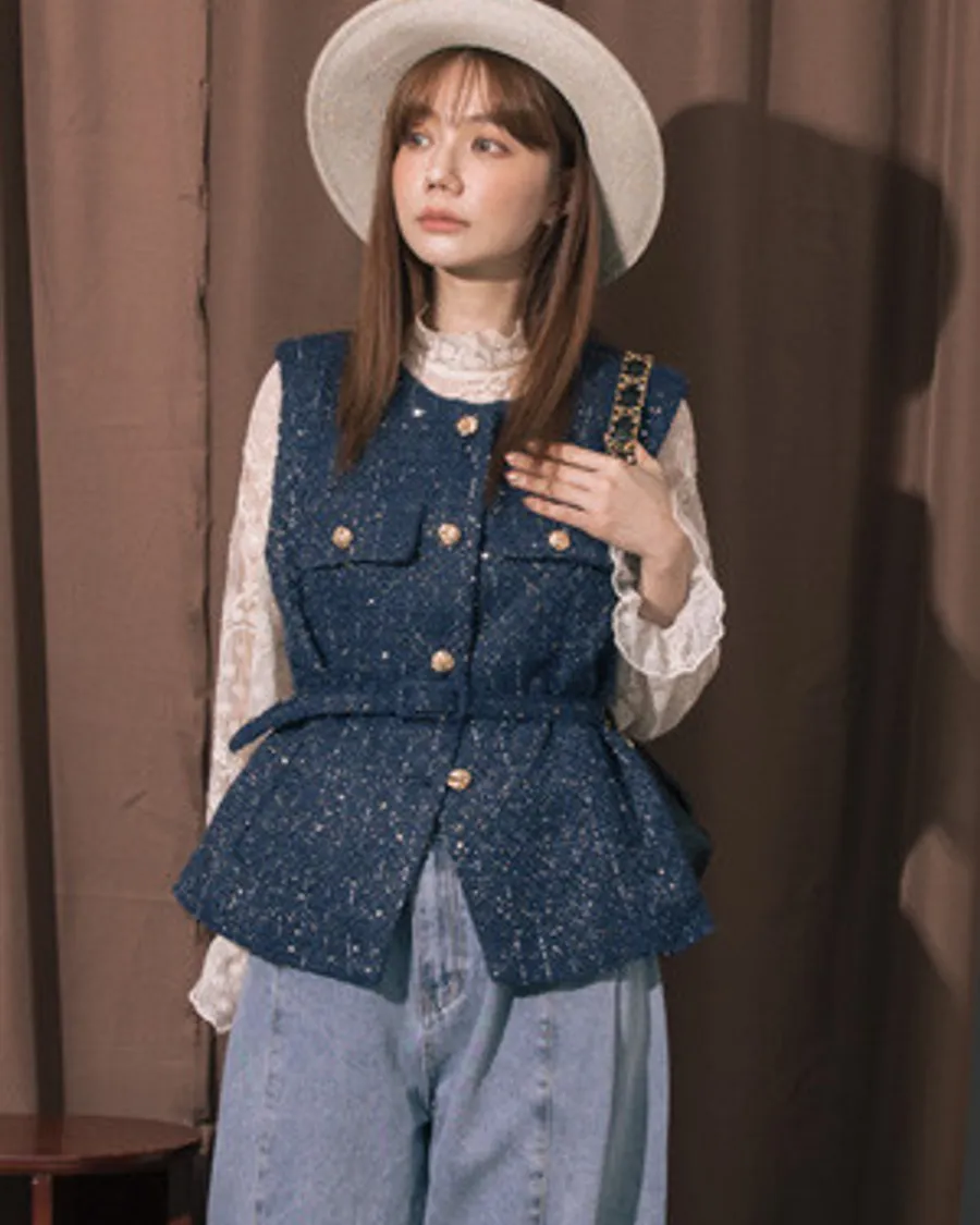 ▲限時搶購780▼小香風亮片織紋金釦系皮帶長版背心
