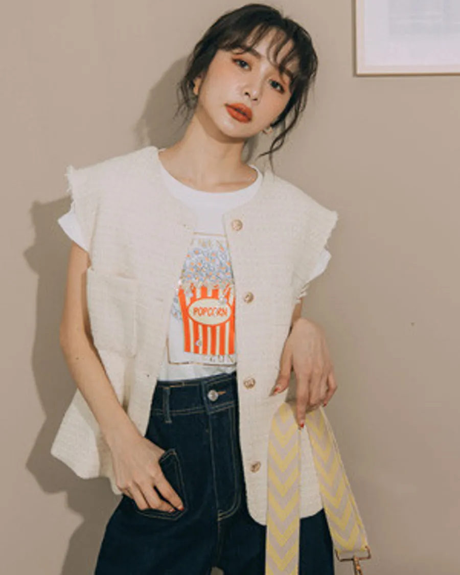 小香風織紋金釦雙口袋圓領貓鬚背心