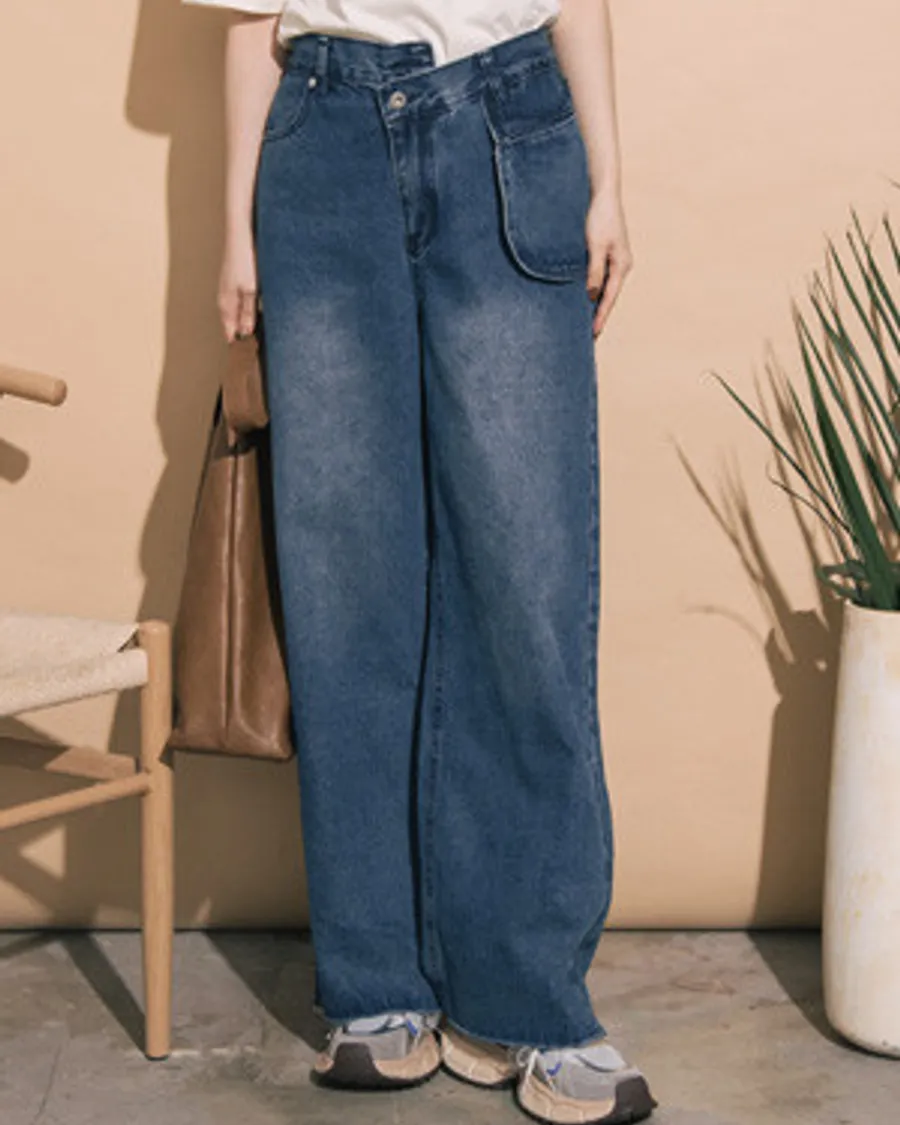 立體口袋層次斜釦水洗刷色牛仔長褲