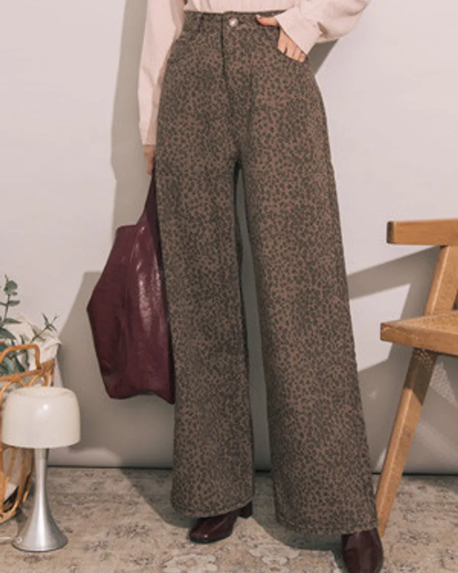 復古刷色豹紋牛仔寬口長褲