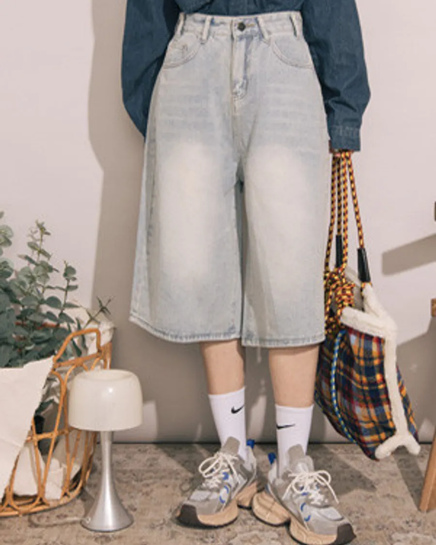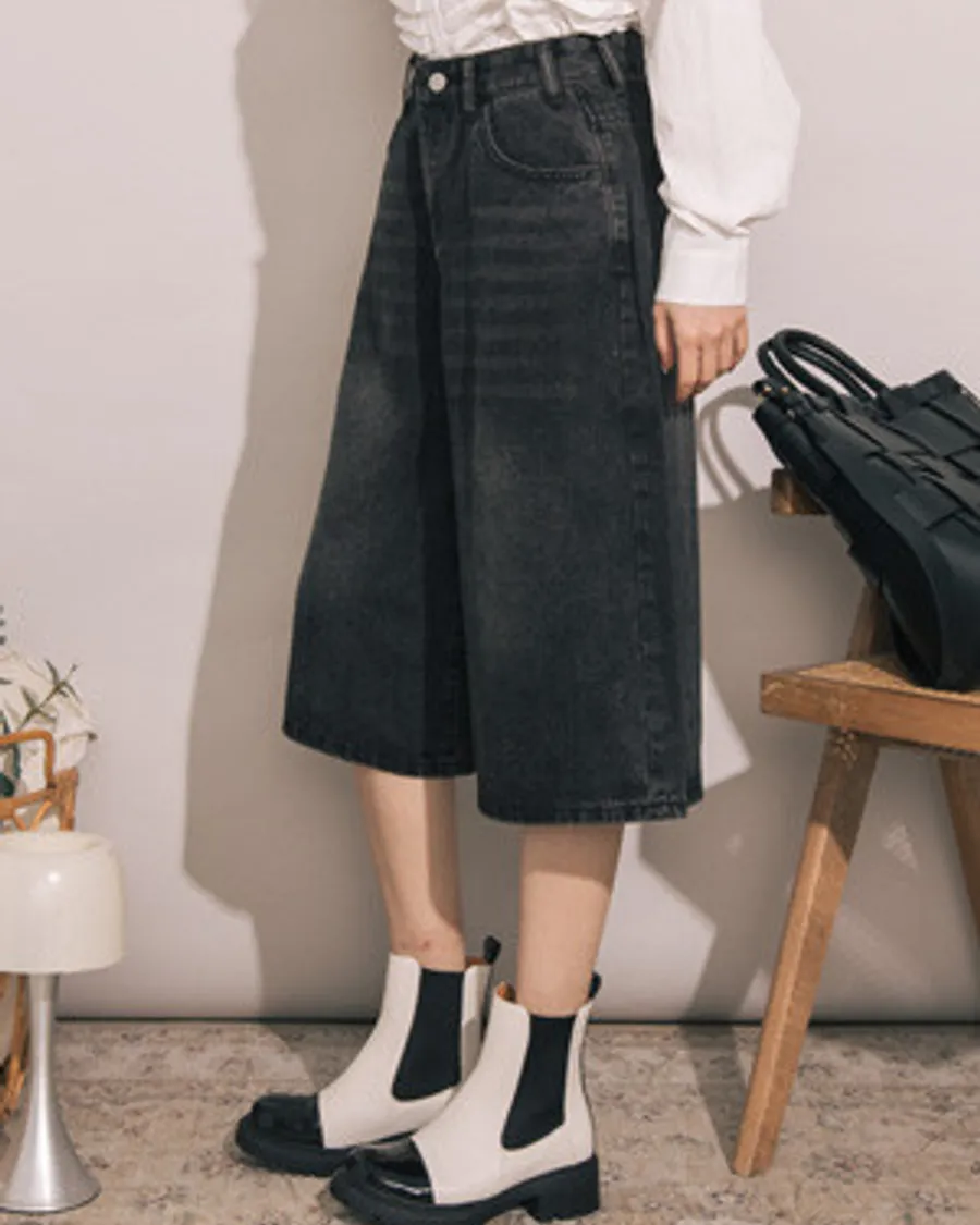 復古刷色牛仔七分寬口短褲