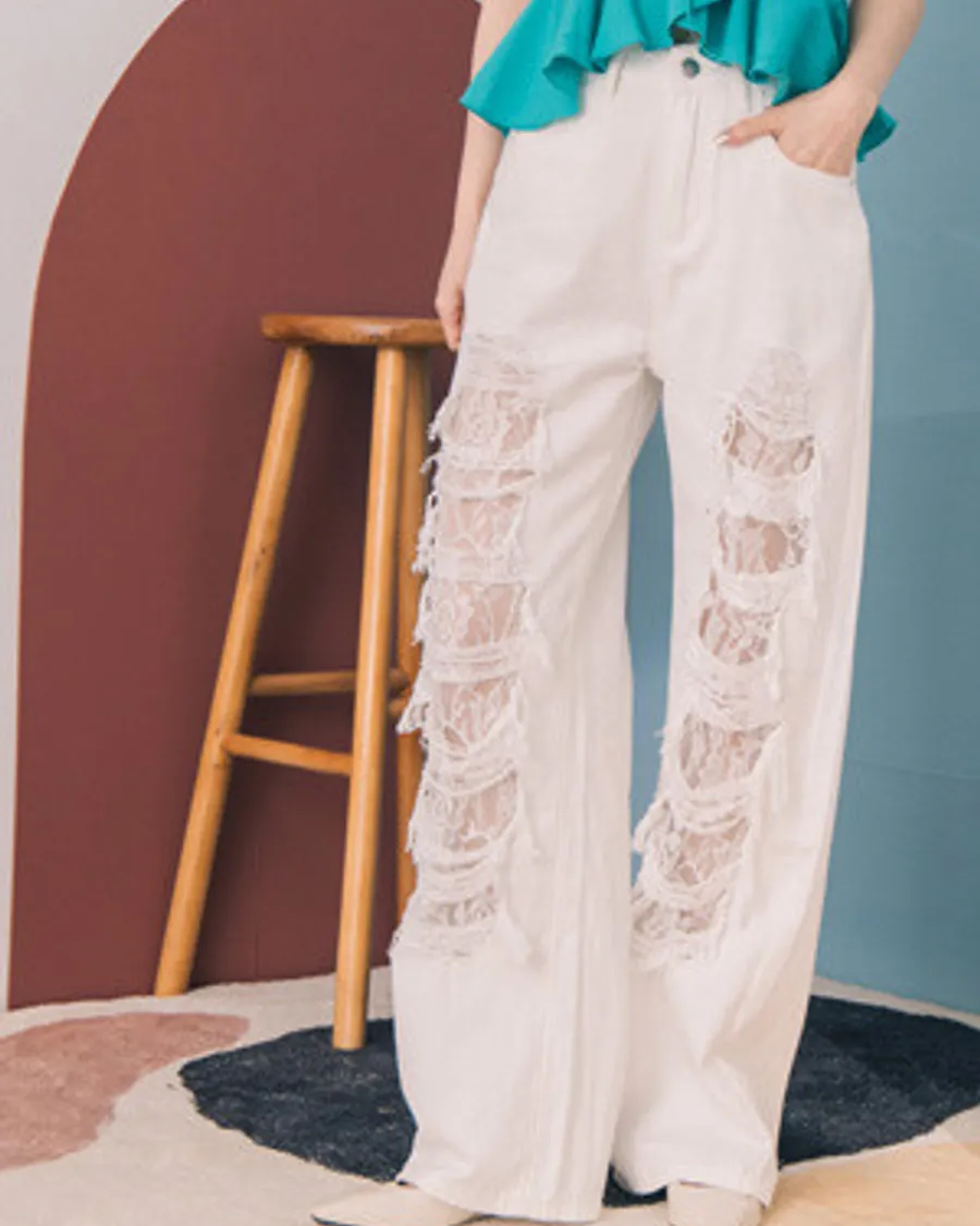蕾絲刷破貓鬚破口牛仔長褲