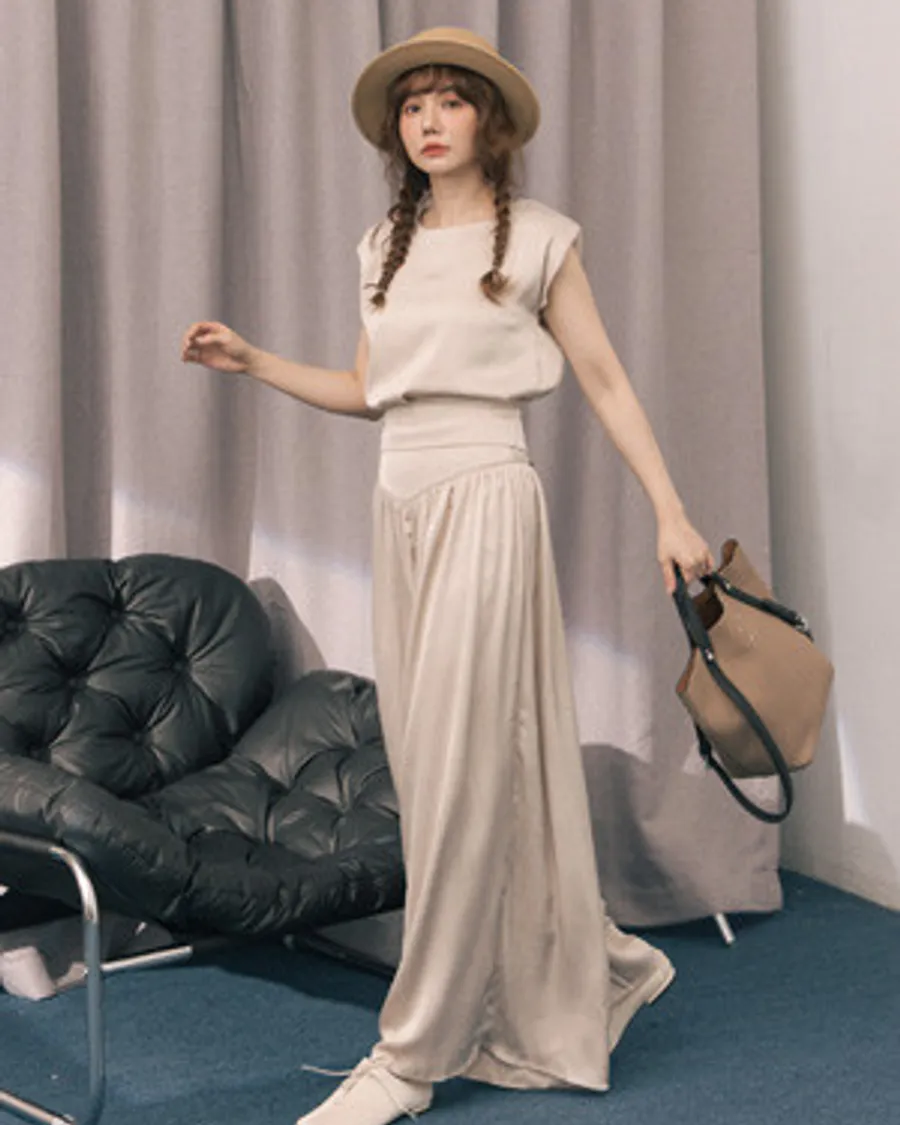 光澤感絲滑料緞面後綁帶上衣+寬口長褲套裝