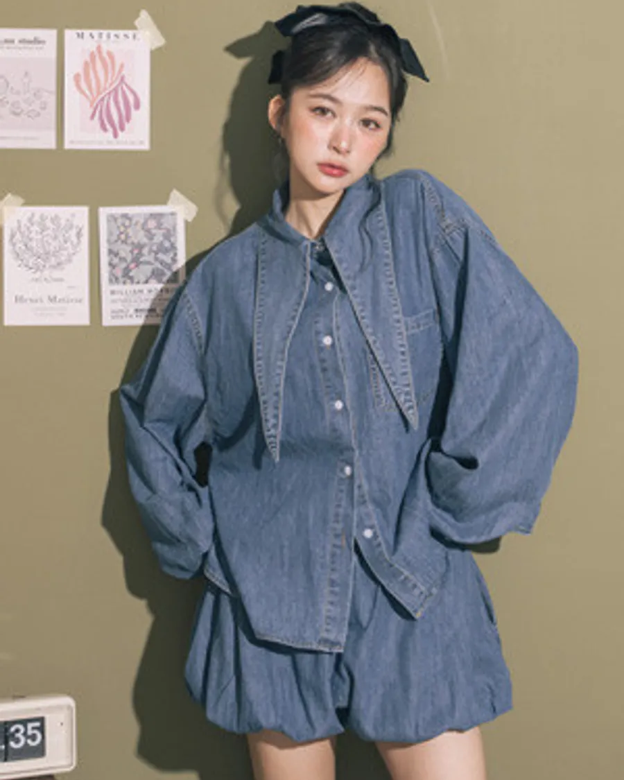 兔耳領水洗牛仔襯衫+澎澎短褲套裝