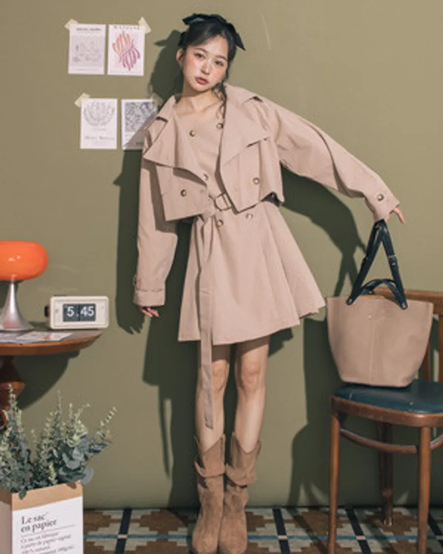 兩件式無袖繫帶小洋裝+短版風衣外套