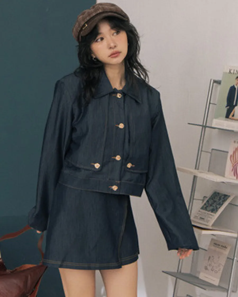 車線前片設計襯衫+釦環褲裙牛仔套裝