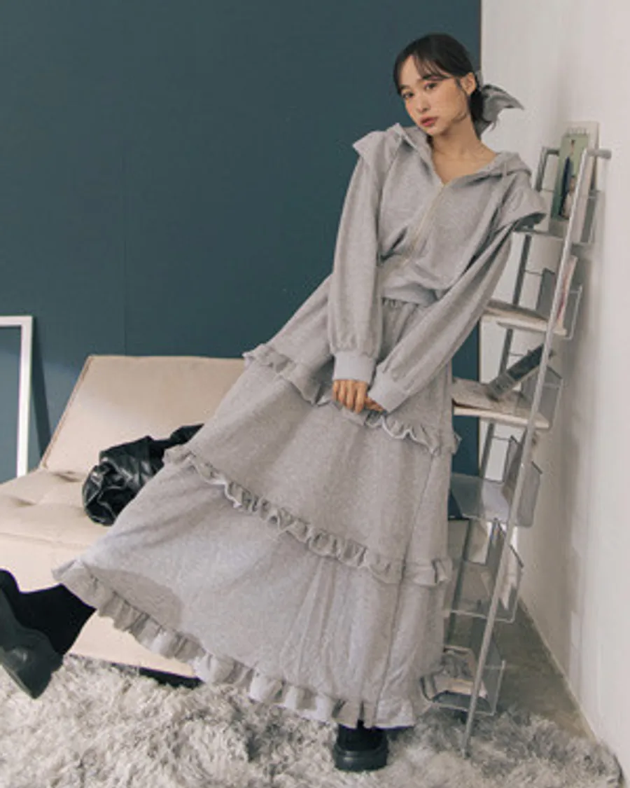 設計款剪裁連帽拉鍊上衣+木耳邊蛋糕長裙套裝