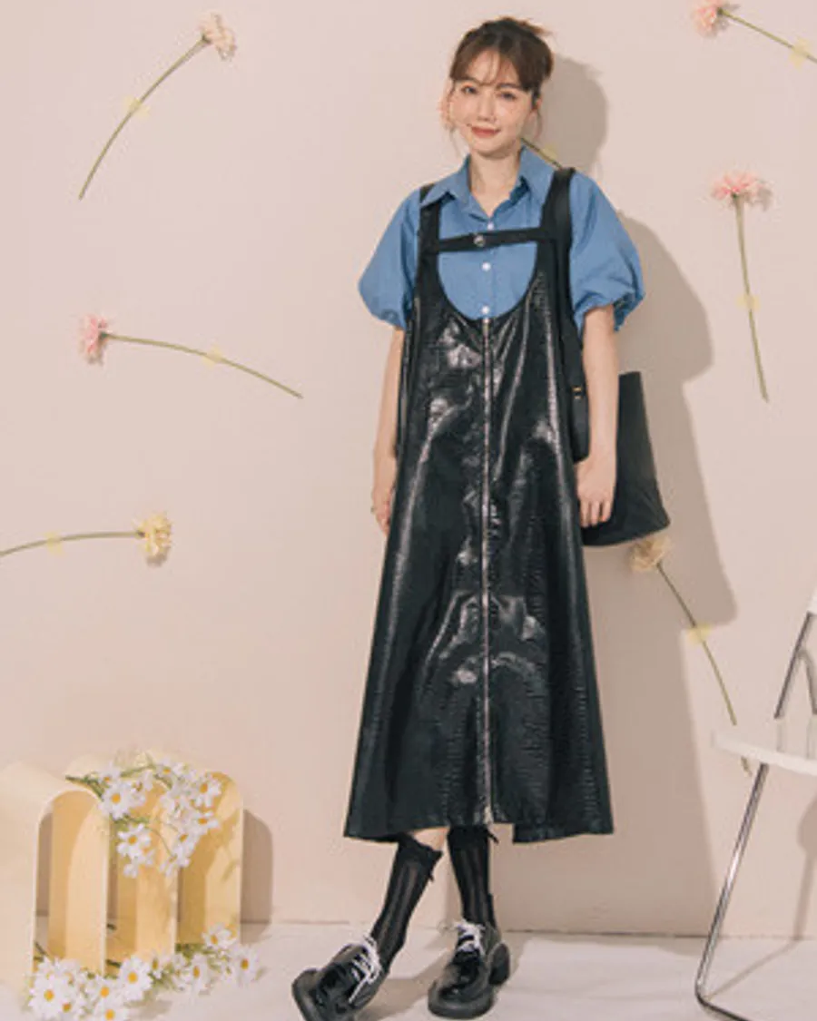 動物壓紋拉鍊設計吊帶皮質洋裝