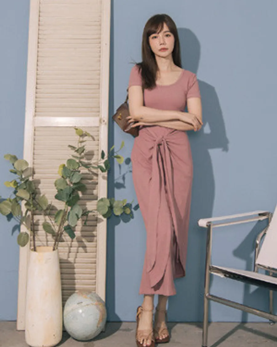 ▲限時搶購780▼純色U領層次綁帶連身洋裝