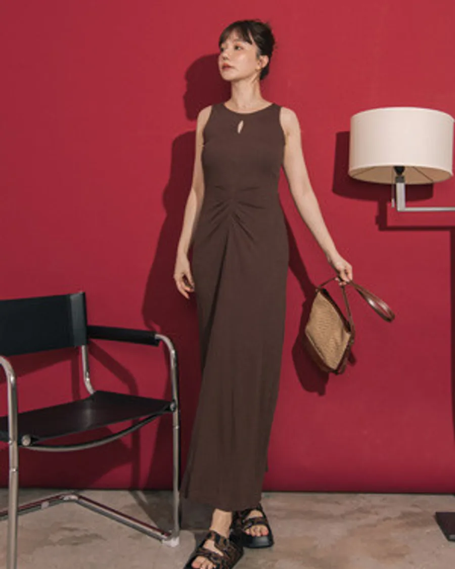 ▲限時搶購699▼純色簍空抓皺感包臀連身棉質洋裝
