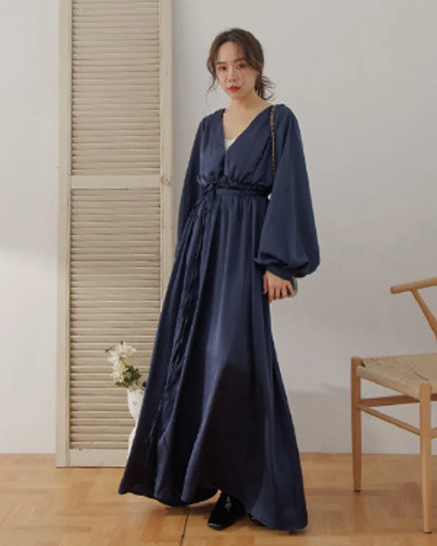 高級感光澤緞面V領簡約綁帶澎澎袖長洋裝