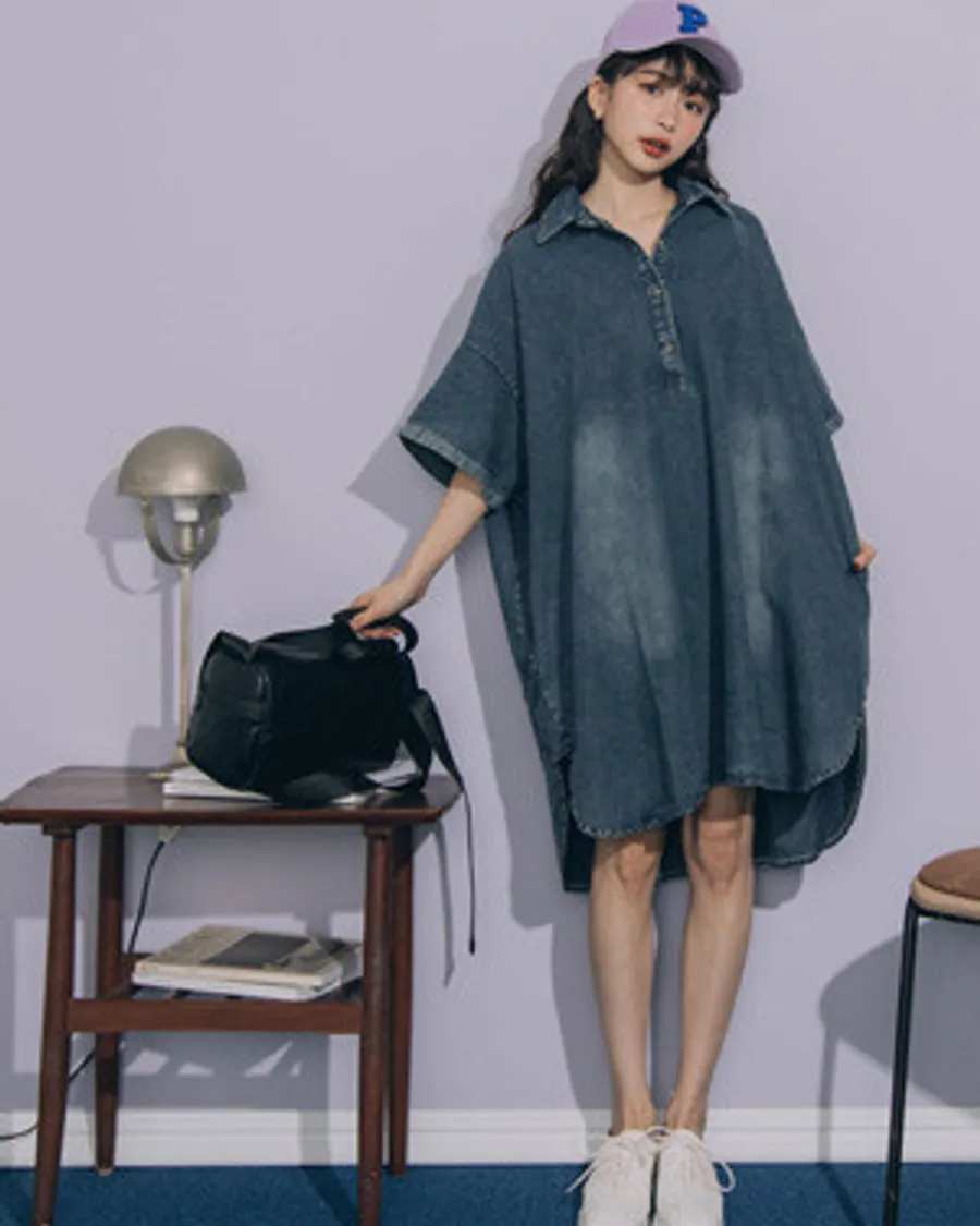 ▲限時搶購780▼復古刷色寬袖開岔寬版牛仔襯衫式洋裝
