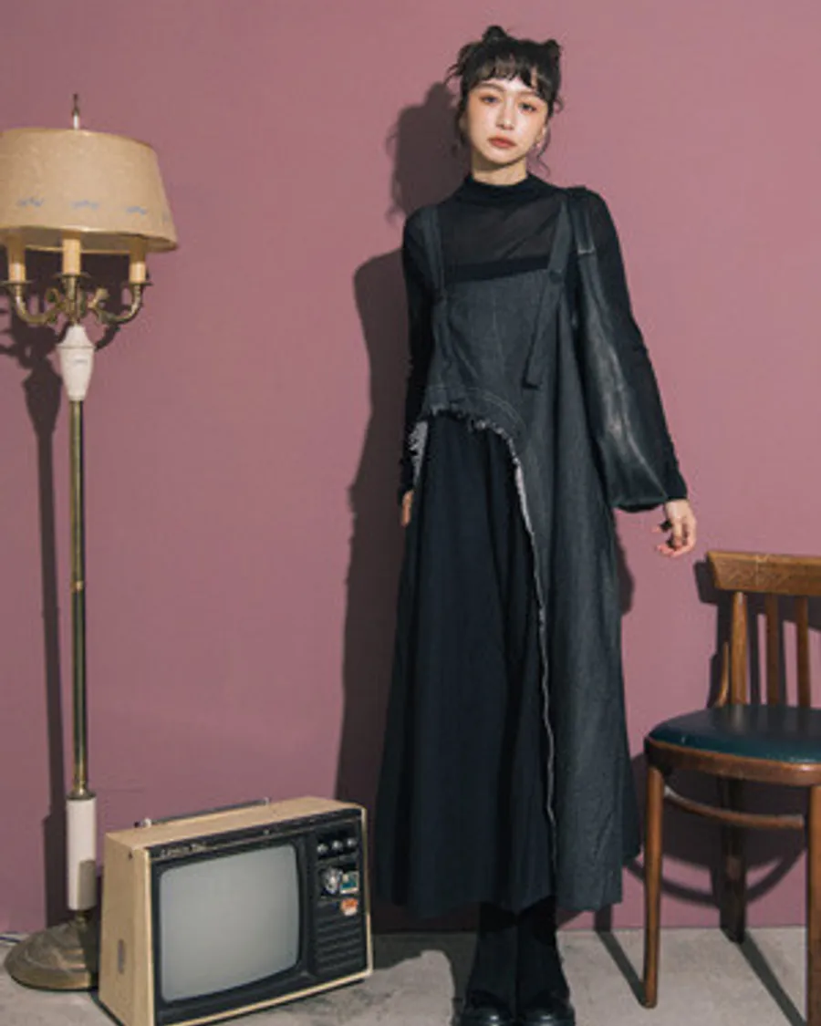 設計寬牛仔拼接貓鬚剪裁吊帶洋裝